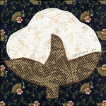 | Another original Alabama Cotton Ball Appliqued Quilt Block in a Batik,Bali, and Fossil Fern Color Theme on Black Background |
