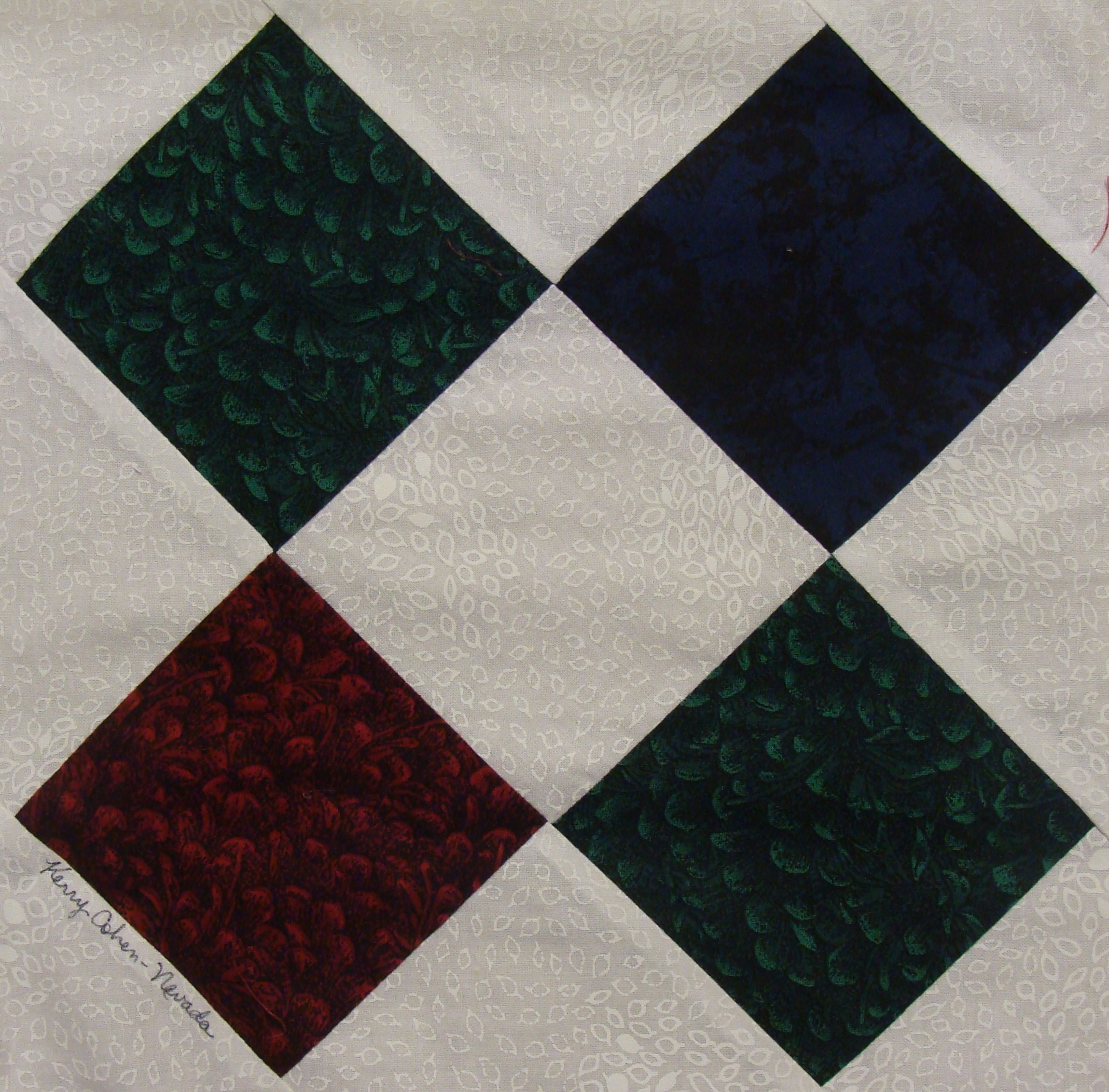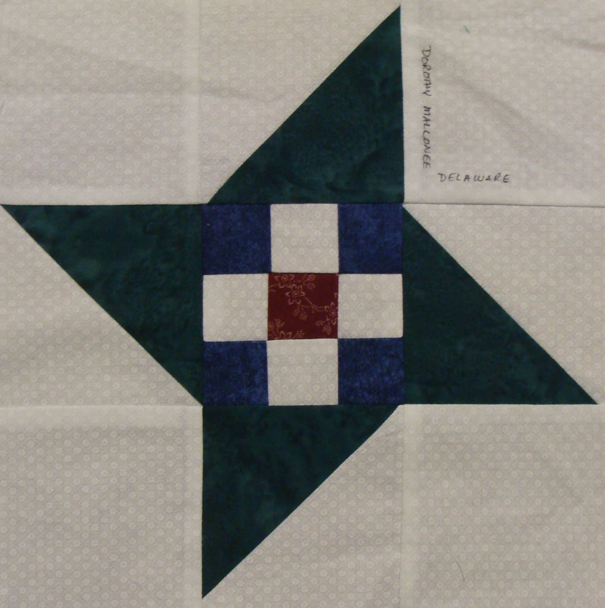 | Traditional 50 State Quilt Block Swap Our quilting group swapped 9 inch 50 State Quilt Blocks in Maroon/Hunter Green/Navy/White Color Theme The original designs are protected by copyright. Please do not copy or use them other than for inspiration. Relax, sit back, scan down and enjoy our quilters creativity and appreciation of the history behind each state quilt block. Hostess Vivian Ernsberger Completed March 2004 Click on quilt blocks for a larger view and name link for more State quilt blocks and State Info |