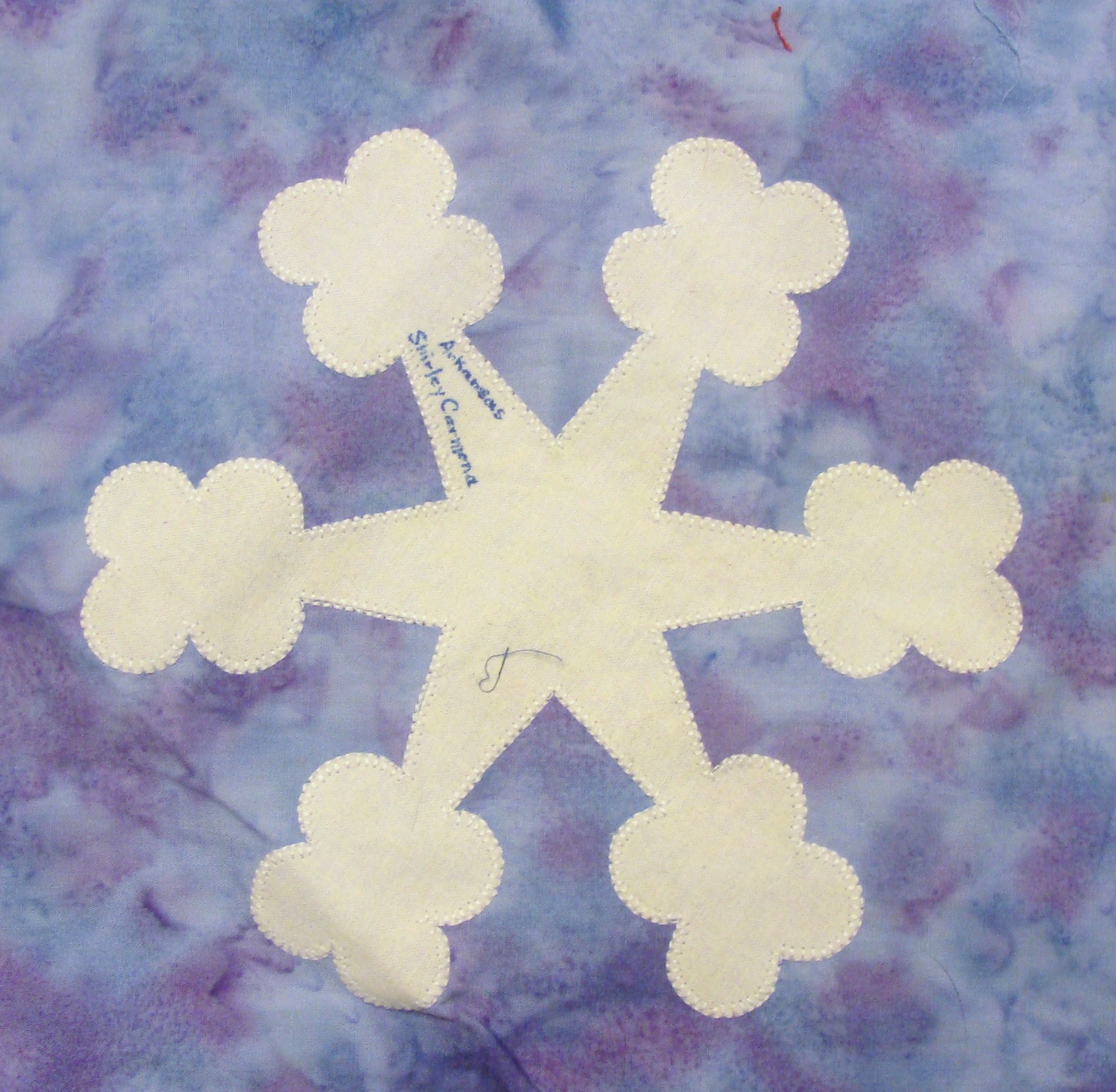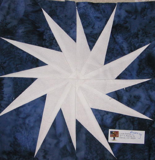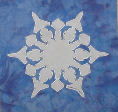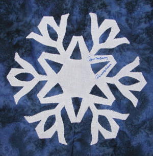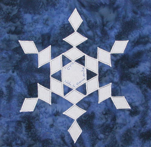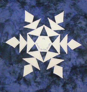 | Glow in the Dark Snowflake 50 State Quilt Blocks Our quilting group swapped 9 inch 50 state quilt blocks in a Snowflake Theme. Our group used glow in the dark fabric for the snowflake on a dark or light blue batik background. The original designs are protected by copyright. Please do not copy or use them other than for inspiration. Relax, sit back, scan down and enjoy our quilters creativity. Hostess Teresa Drummond Completed in 2005 Click on quilt blocks for larger images and name links for more State quilt blocks and State Info |
