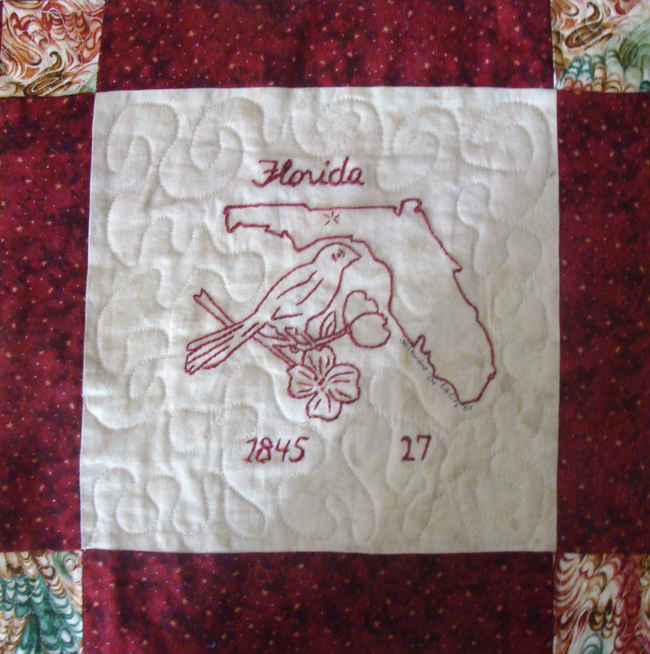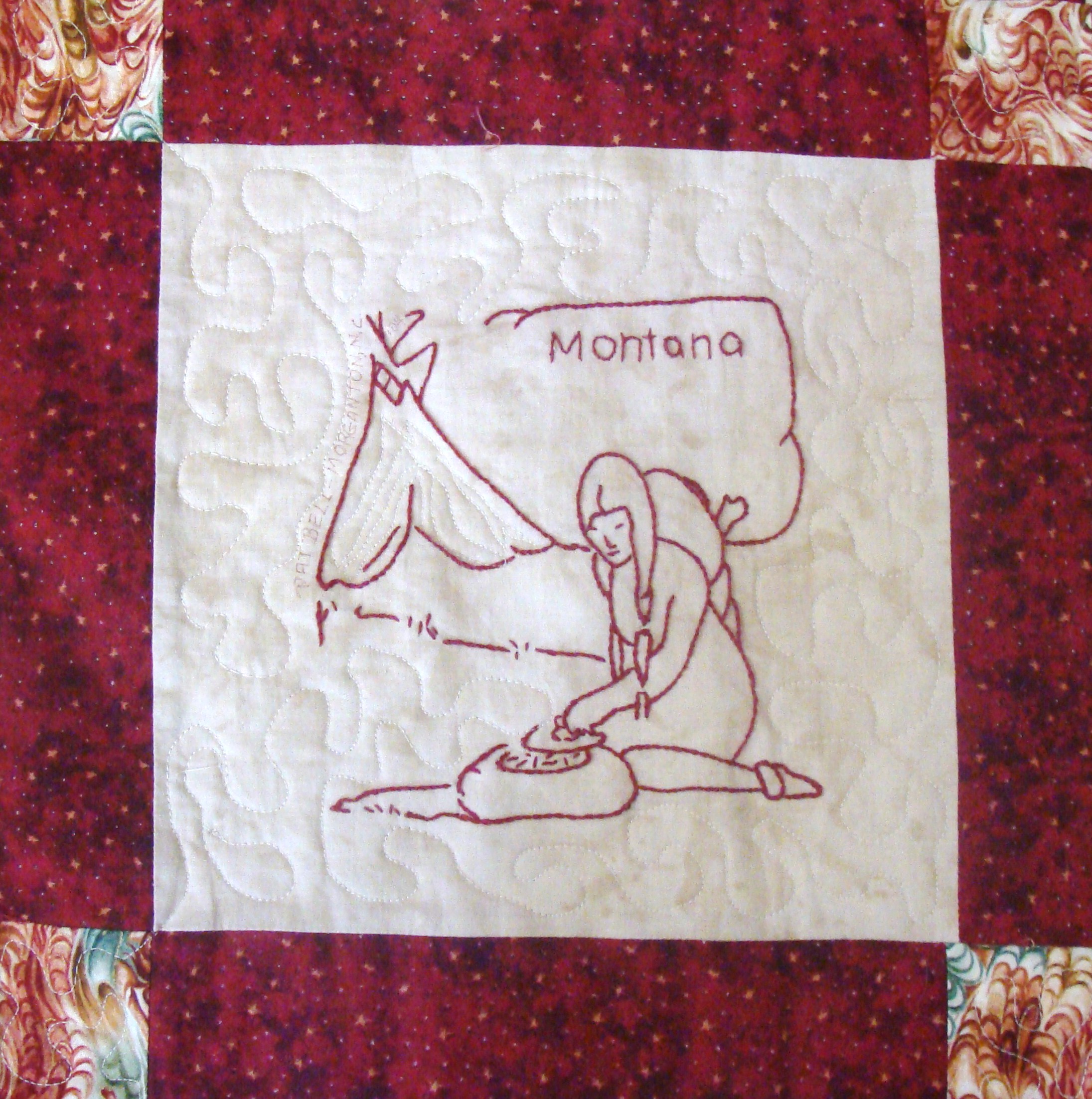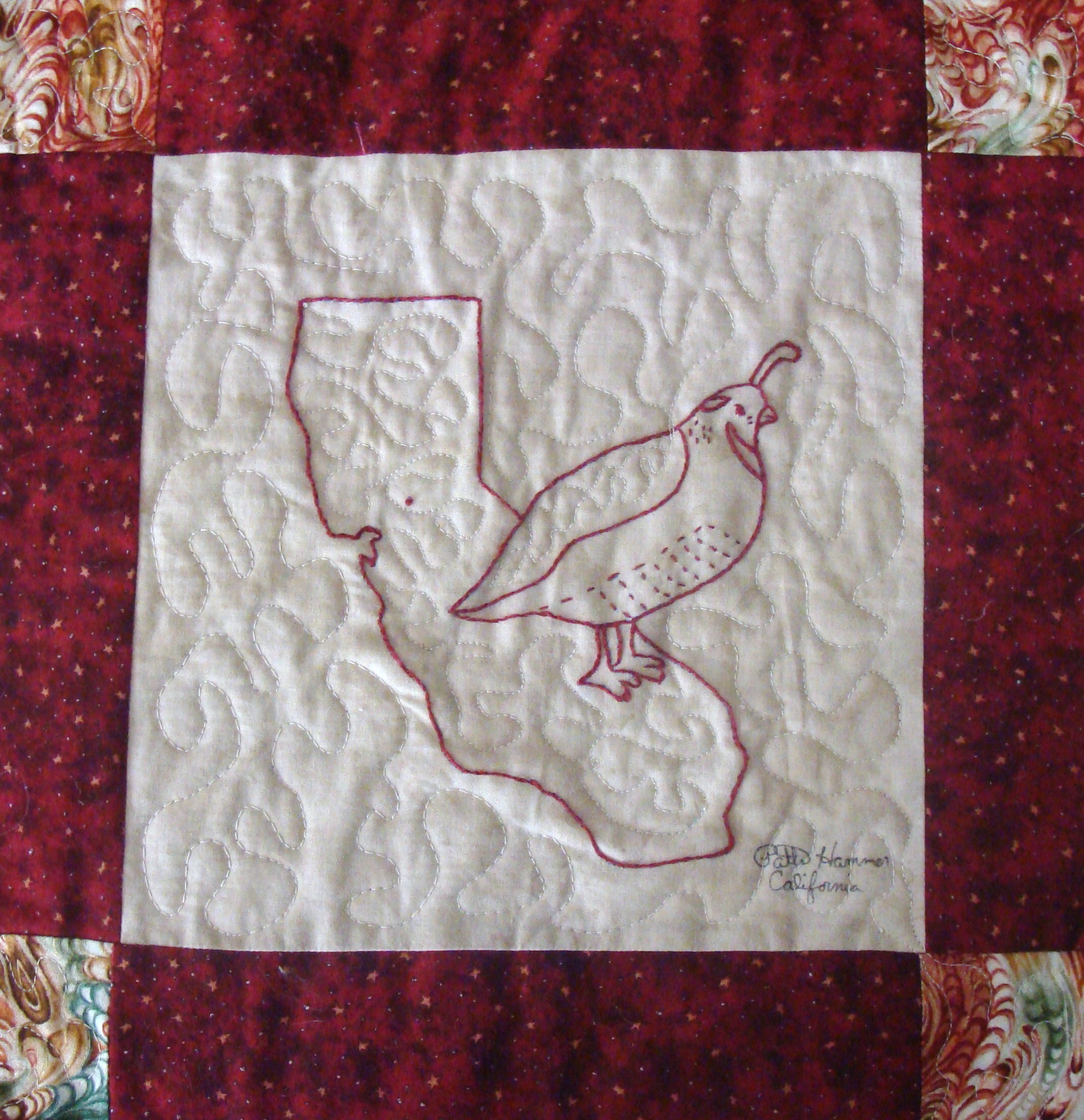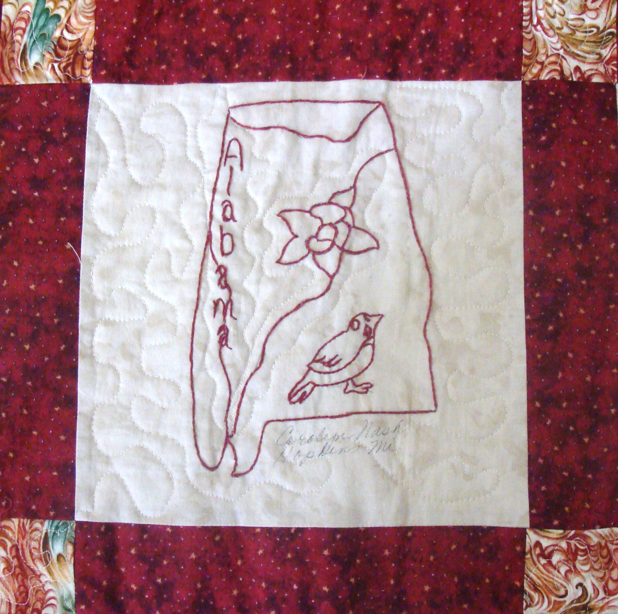 | Redwork 50 State Quilt Blocks Our quilting groups swapped 9 inch 50 State Redwork quilt blocks. Our quilt blocks are unique and were designed by the quilters to represent their states. The original designs are protected by copyright. Please do not copy or use them other than for inspiration. Relax, sit back, scan down and enjoy our quilters creativity and appreciation of the history behind each state quilt block. Hostess Teresa Drummond Completed 2004 Click the quilt blocks for larger image and name link for more State quilt blocks and State Info |