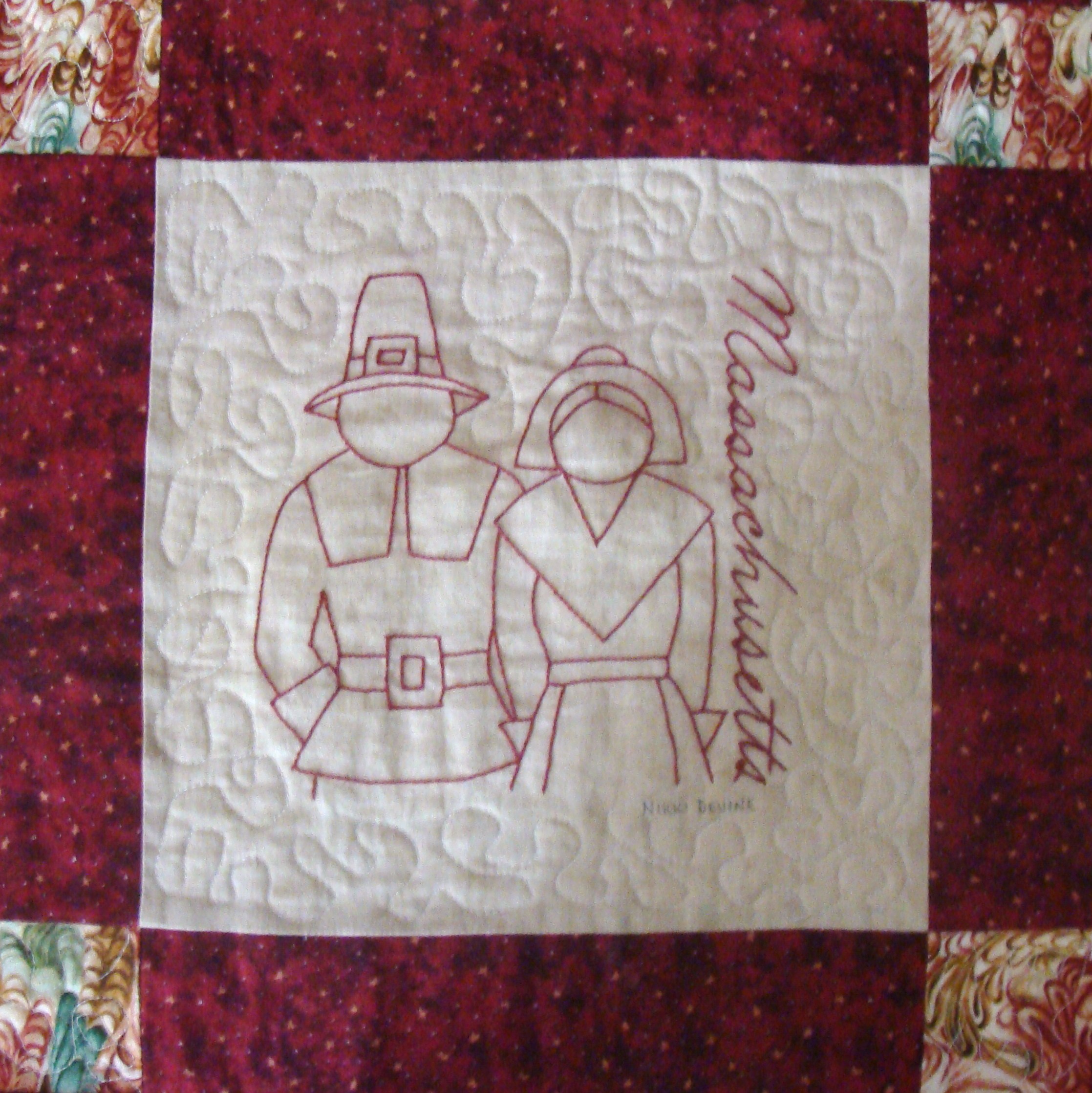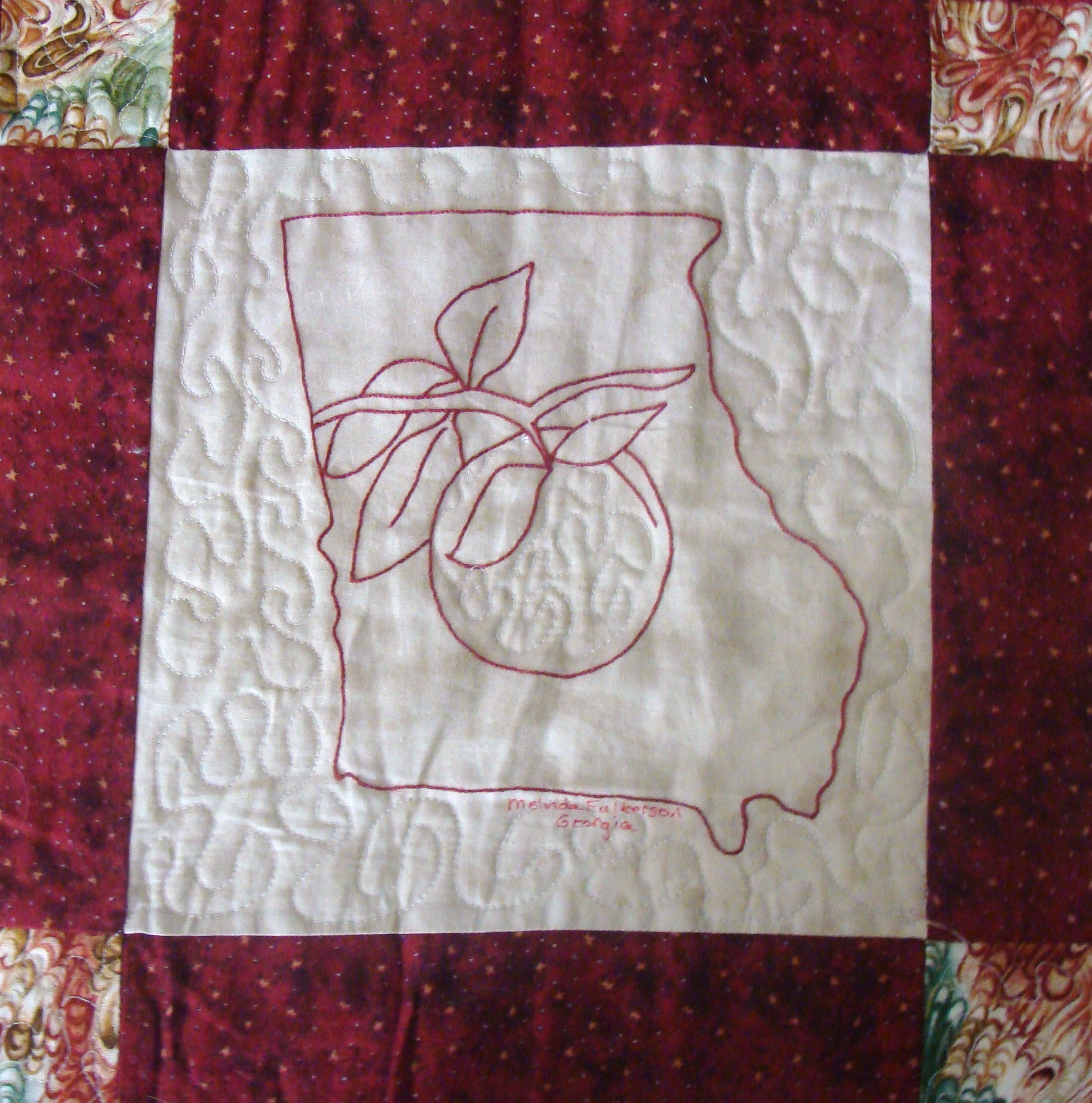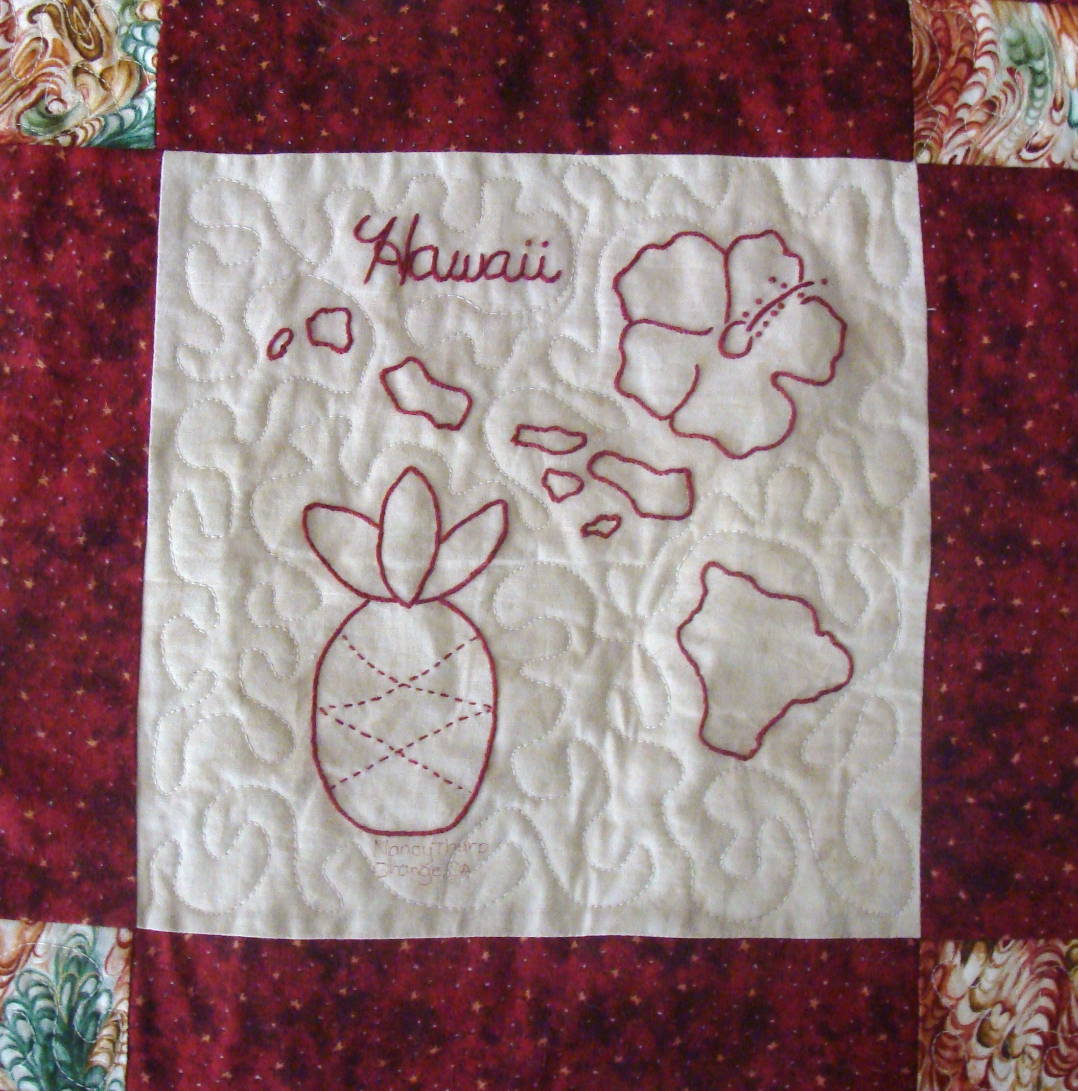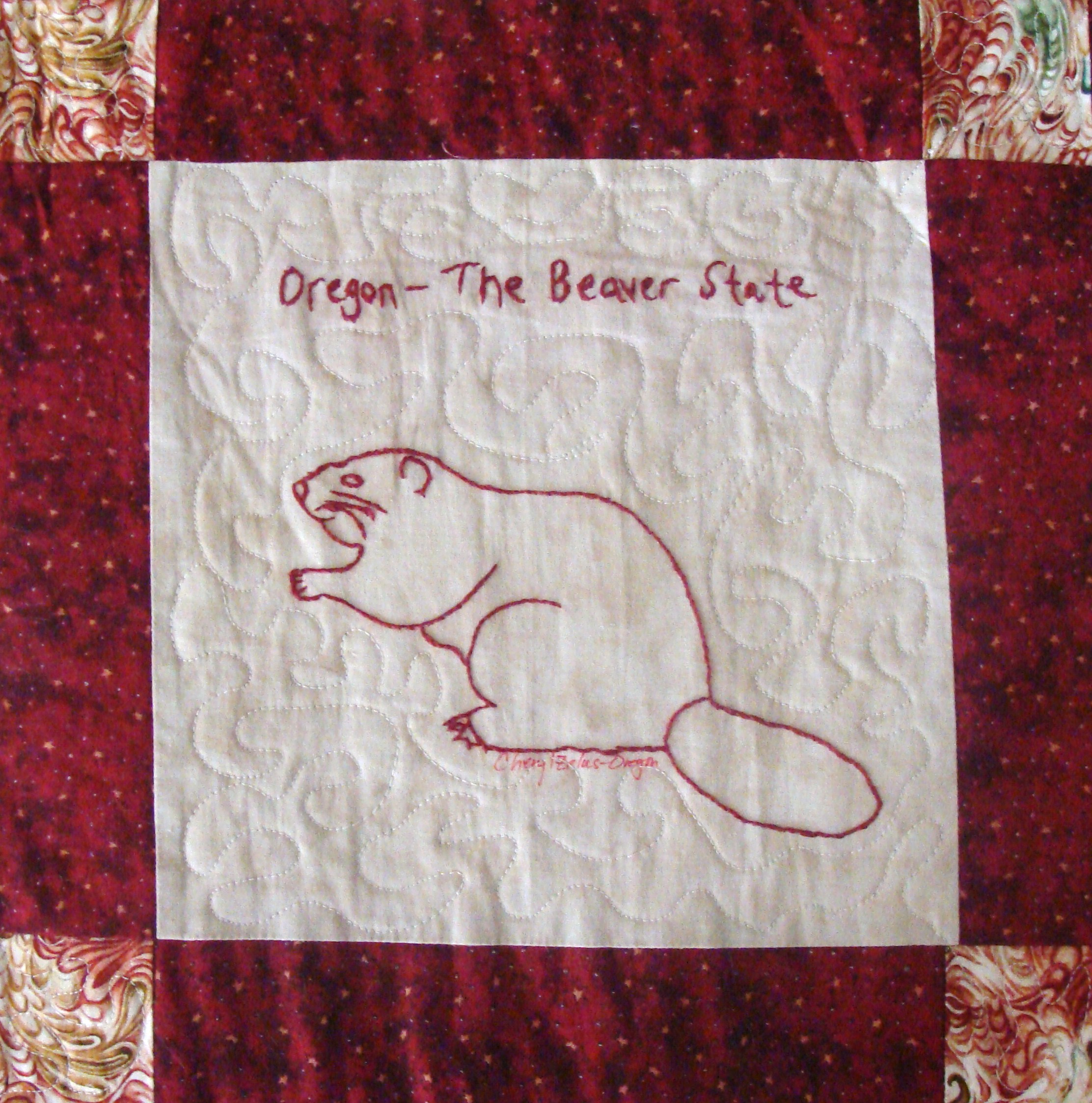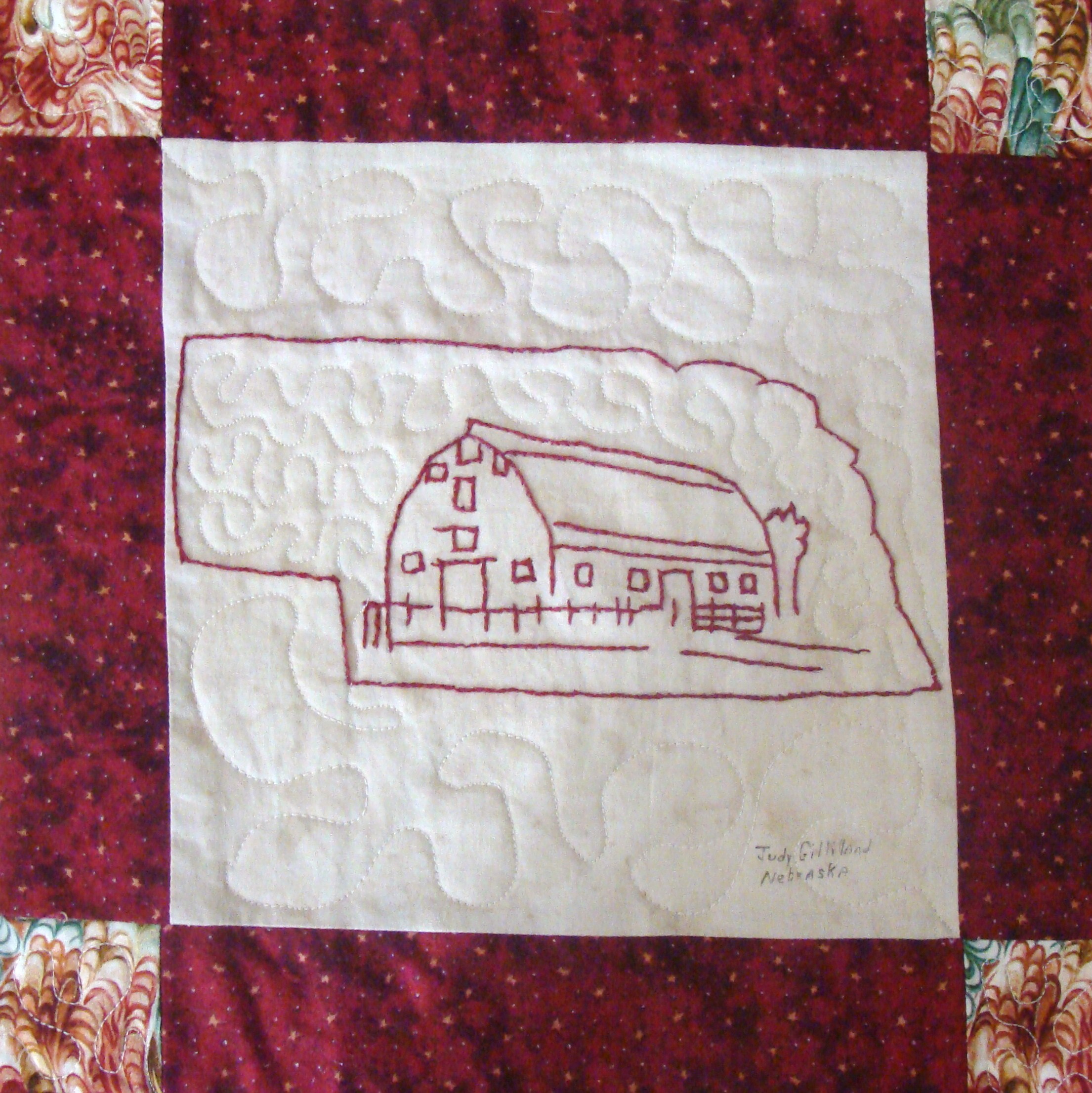 | Redwork 50 State Quilt Blocks Our quilting groups swapped 9 inch 50 State Redwork quilt blocks. Our quilt blocks are unique and were designed by the quilters to represent their states. The original designs are protected by copyright. Please do not copy or use them other than for inspiration. Relax, sit back, scan down and enjoy our quilters creativity and appreciation of the history behind each state quilt block. Hostess Teresa Drummond Completed 2004 Click the quilt blocks for larger image and name link for more State quilt blocks and State Info |