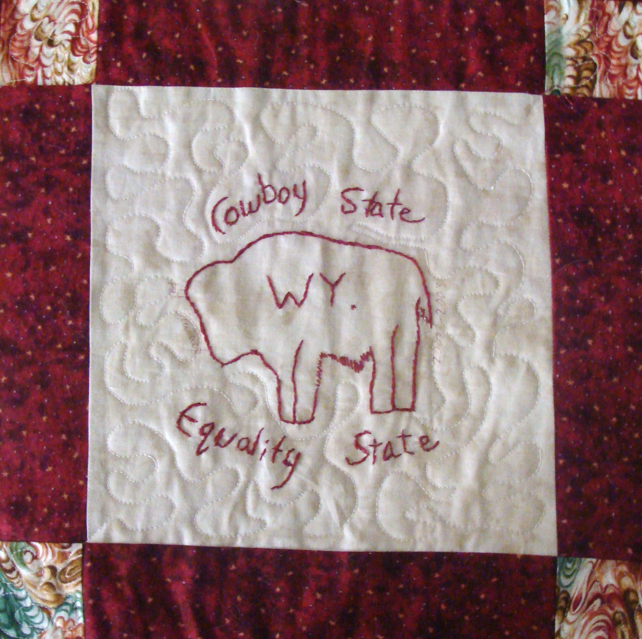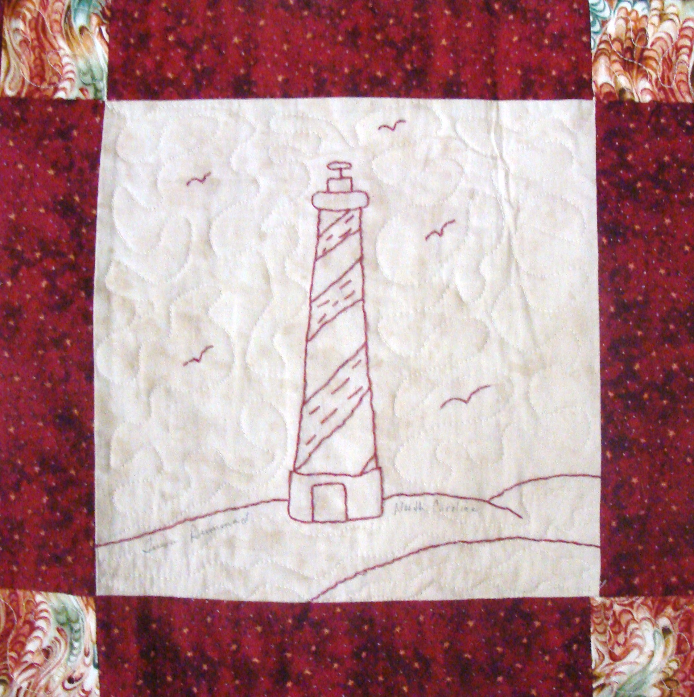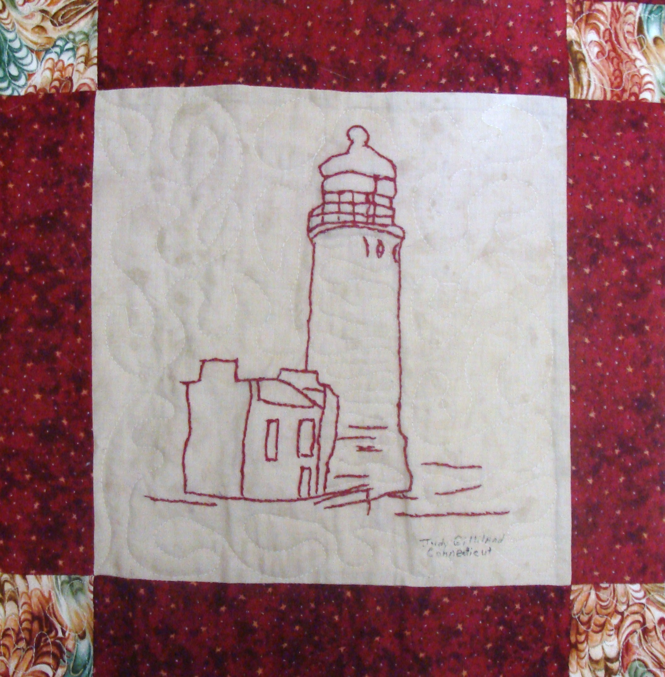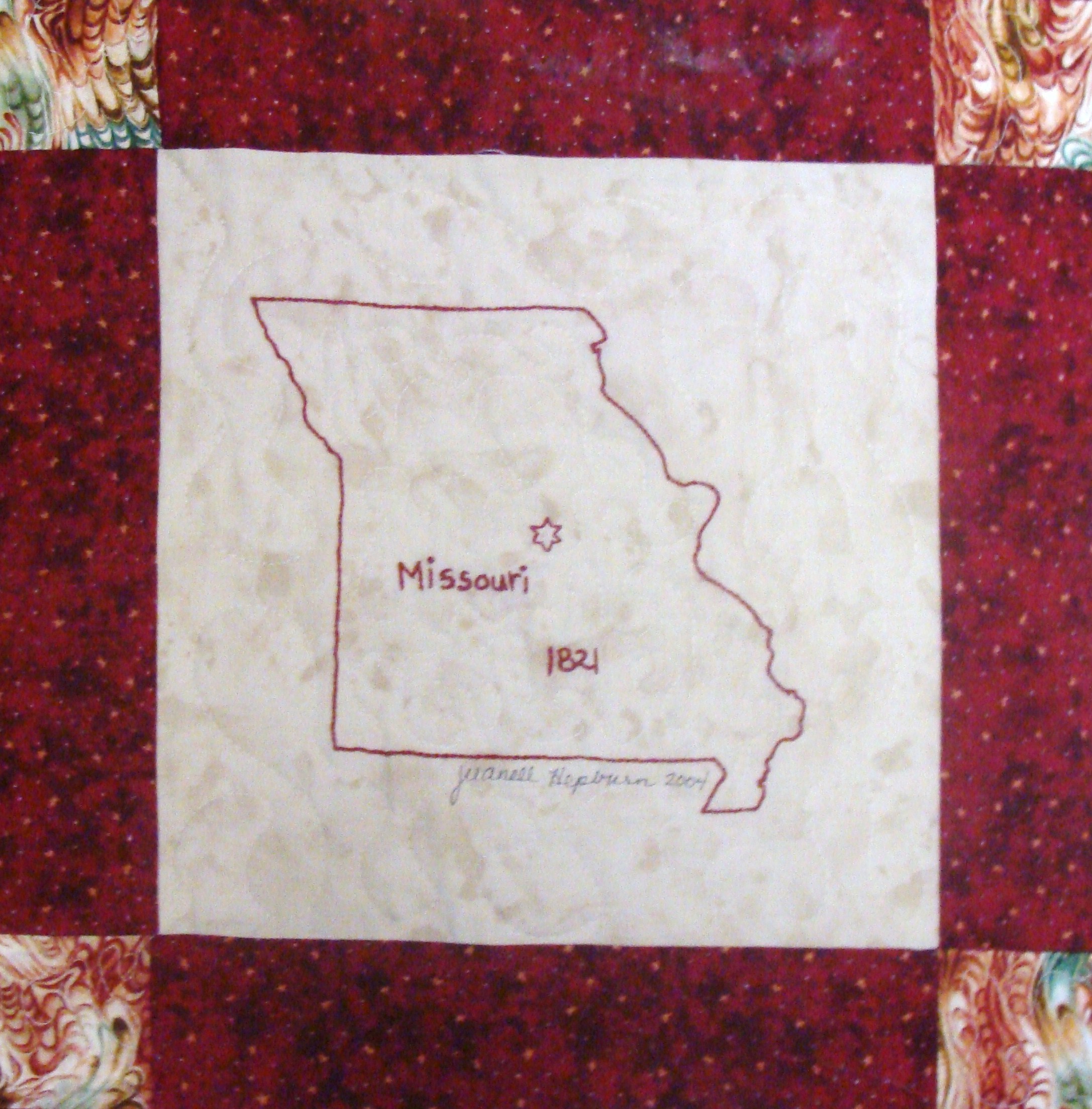 | Redwork 50 State Quilt Blocks Our quilting groups swapped 9 inch 50 State Redwork quilt blocks. Our quilt blocks are unique and were designed by the quilters to represent their states. The original designs are protected by copyright. Please do not copy or use them other than for inspiration. Relax, sit back, scan down and enjoy our quilters creativity and appreciation of the history behind each state quilt block. Hostess Teresa Drummond Completed 2004 Click the quilt blocks for larger image and name link for more State quilt blocks and State Info |