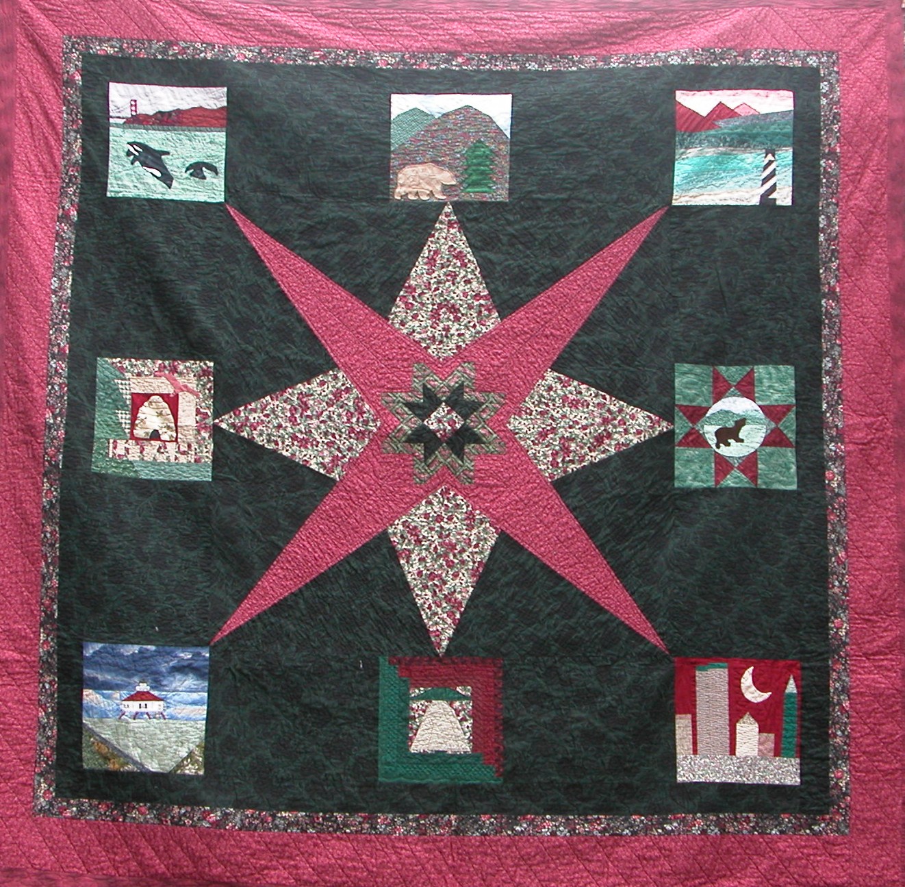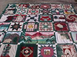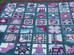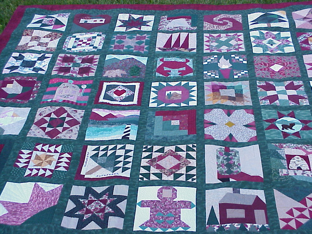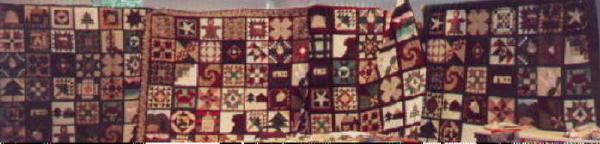 | Traditional 50 State Quilt Block Swap Our quilting group swapped 12 inch 50 State Quilt Blocks in Burgandy/Forest Green/Cream Color Theme Hostesses Teresa Drummond and Wendy Clark On the weekend of Apri 25, 1998 quilters from our swap came as far away as Utah to help me sort our 2500 state quilt blocks and to sew the two Breast Cancer Survivor/Memorial Breast Cancer Quilts. You can read more about our gatherings on our History link to the right. Then our group had a reunion in 2001 and many quilters brought their completed Nifty Fifty Quilts to share with our group. At this reunion we sorted international quilt blocks from our Twenty Plenty International Quilt Blocks swap and we sewed together the Twenty Plenty Breast Cancer Quilts. |