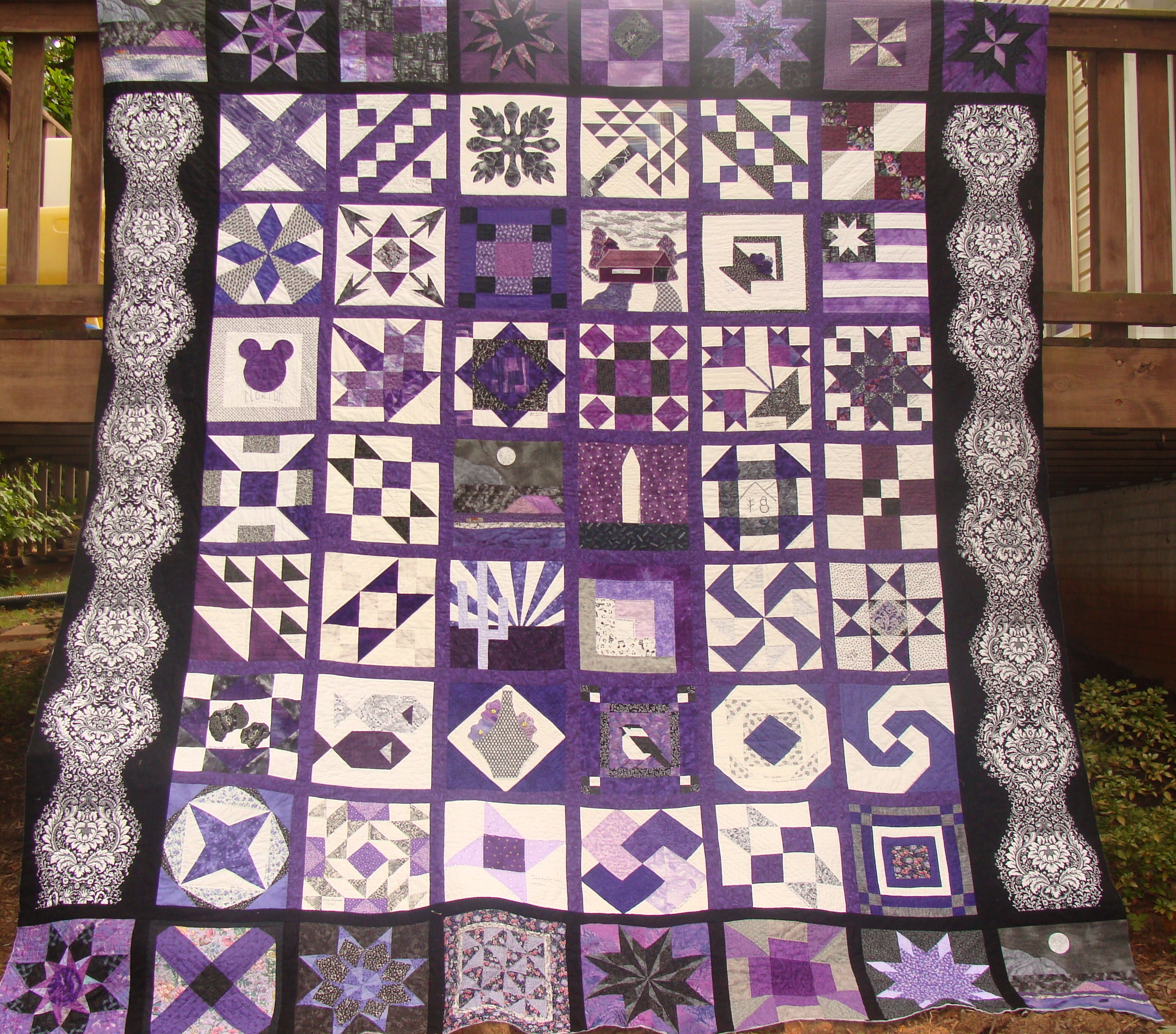 | Traditional 50 State Quilts Photos of our Nifty Fifty 50 State Quilts from our Nifty Fifty 7 Swap Our group swapped 12 inch quilt blocks in a Purple/Black/White ColorTheme Hostess Linda Ferguson Completed January 2002 Click on quilts for a larger view |